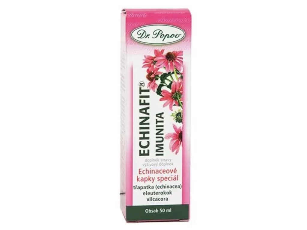 Echinafit imunita jsou Echinaceové kapky speciál. Spojují v sobě sílu 3 bylin, doporučovaných na podporu imunitního systému. Třapatka je využívána indiány v tradiční medicíně. Ve výrobku je použita směs třapatky nachové a třapatky bledé. Echinacea je vynikající pro přirozenou obranyschopnost a podporuje zdravé fungování dýchacích cest. Eleuterokok (čertův kořen) je pro své účinky nazýván sibiřským žen-šenem. Patří do skupiny adaptogenů, tj. látky, které mají komplexní účinky a napomáhají adaptaci organizmu na vnější podmínky. Eleuterokok pomáhá obnovovat energii, podporuje přirozenou obranyschopnost a přispívá k celkovému zdraví. Vilcacora roste v tropických lesích amazonské džungle. Do bylinných přípravků se využívá kůra, která významně přispívá k fungujícímu imunitnímu systému.